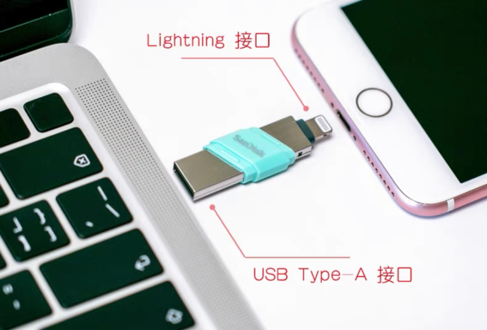 如果觉得用数据线连接电脑还麻烦,那就可以用双插口的手机U盘。