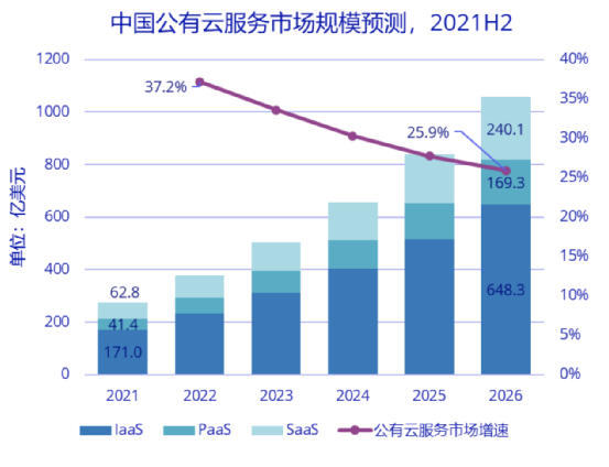 IDC数据显示,2020年全球公有云市场达到3124.2亿美元,同比增长24.1%;中国公有云市场达到193.8亿美元,同比增长49.7%,增速为全球各区域中最高。IDC预计,未来5年,中国公有云市场会以复合增长率30.9%继续高速增长,预计到2026年,市场规模将达到1057.6亿美元,中国公有云服务市场的全球占比将从2021年的6.7%提升为9.9%。