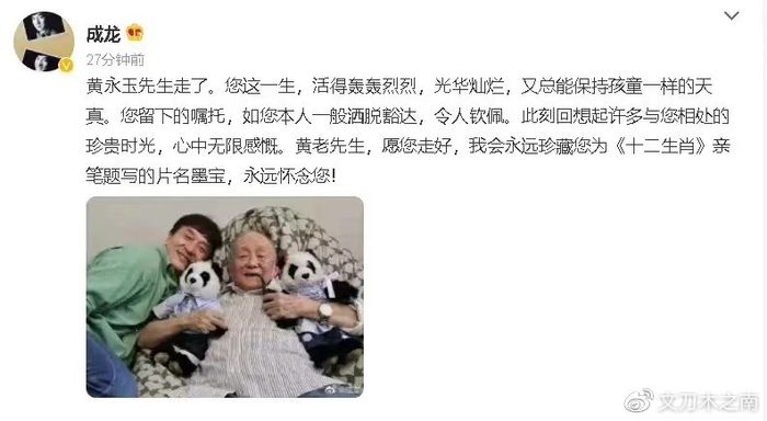 成龙大哥也发文晒图表示哀悼:“黄永玉先生走了。您这一生,活得轰轰烈烈,光华灿烂,又总能保持孩童一样的天真。您留下的嘱托,如您本人一般洒脱豁达,令人钦佩。此刻回想起许多与您相处的珍贵时光,心中无限感慨。黄老先生,愿您走好,我会永远珍藏您为《十二生肖》亲笔题写的片名墨宝,永远怀念您! ”