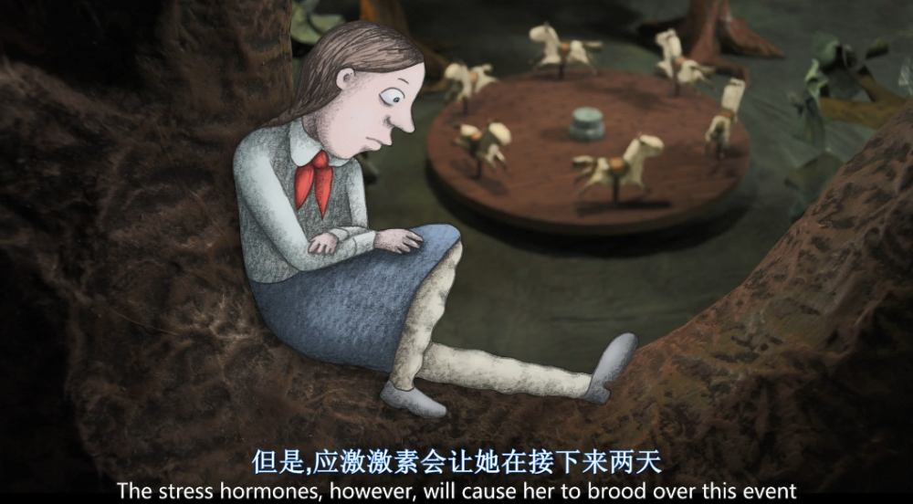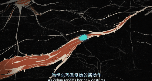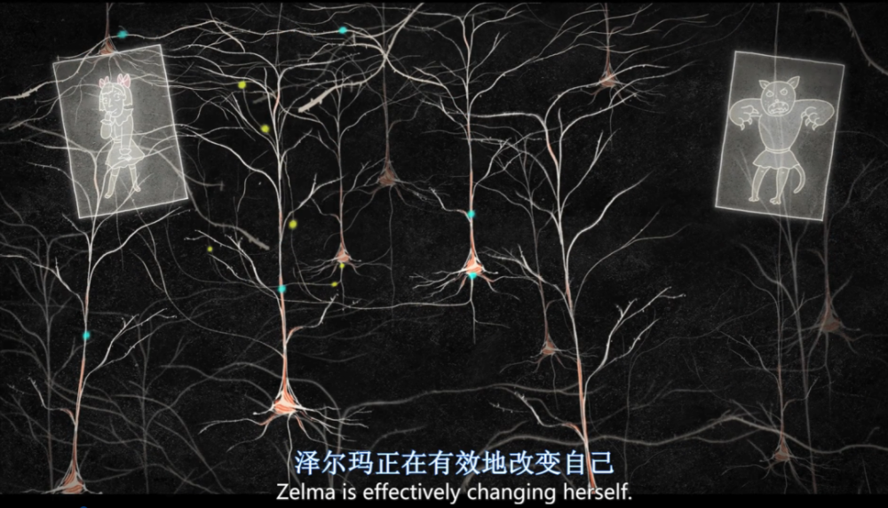 是的,你没想错,就是和教学课堂一样,以动画的方式,展现了这种观念影响下,泽尔玛的大脑中出现的神经变化。