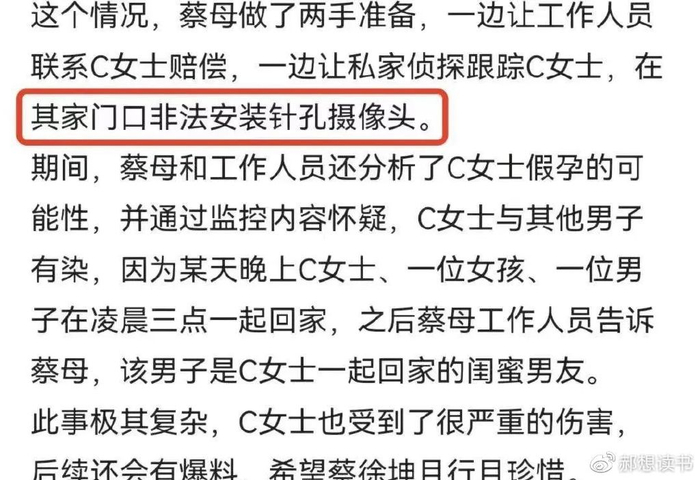 比起蔡徐坤来说,更夸张的是她母亲,为了替儿子找借口各种神操作,比如在C女士家门口安装摄像头,找人跟踪对方,这个消息成为大众谈论的焦点,蔡徐坤母亲的做法究竟有没有违法呢?