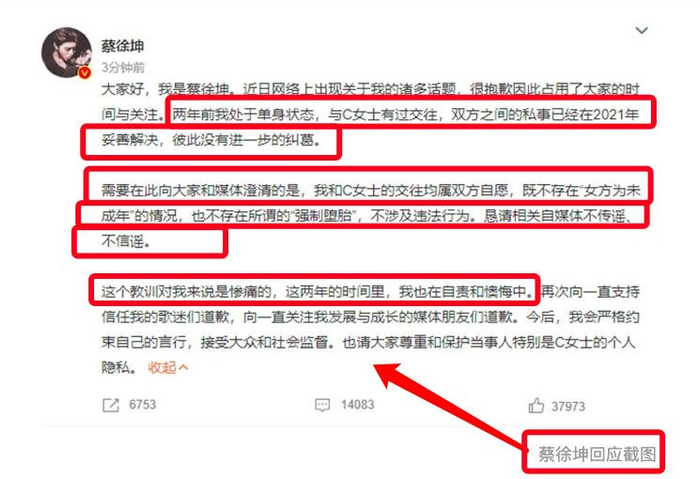 我们先来回忆一下整件事的经过,某狗仔爆出蔡徐坤和C女士一夜情并导致其堕胎的传闻,之后,C女士果断站出来承认此事。