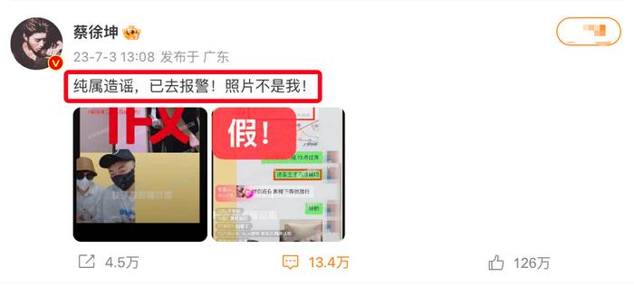 很快,蔡徐坤本人就公开辟谣:纯属造谣,已去报警,照片不是我。