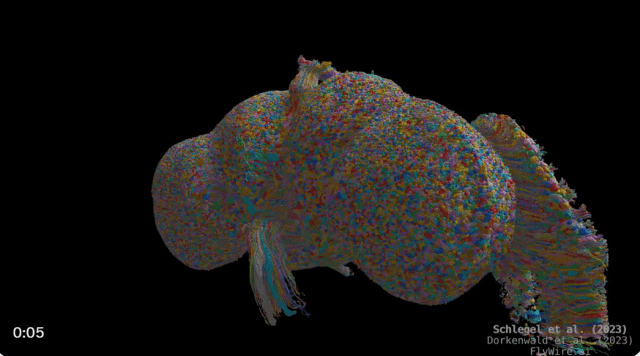 注:FlyWire 是一个用于探索果蝇大脑的全脑连接组学平台。自 2019 年以来,科学家和经验丰富的校对员一直在使用 FlyWire 来校对 AI 对整个果蝇大脑的分割。截至 2023 年 6 月,在 FlyWire 中已经校对了超过 120,000 个神经元,包括整个中央大脑。