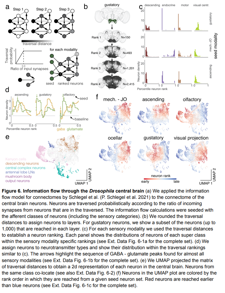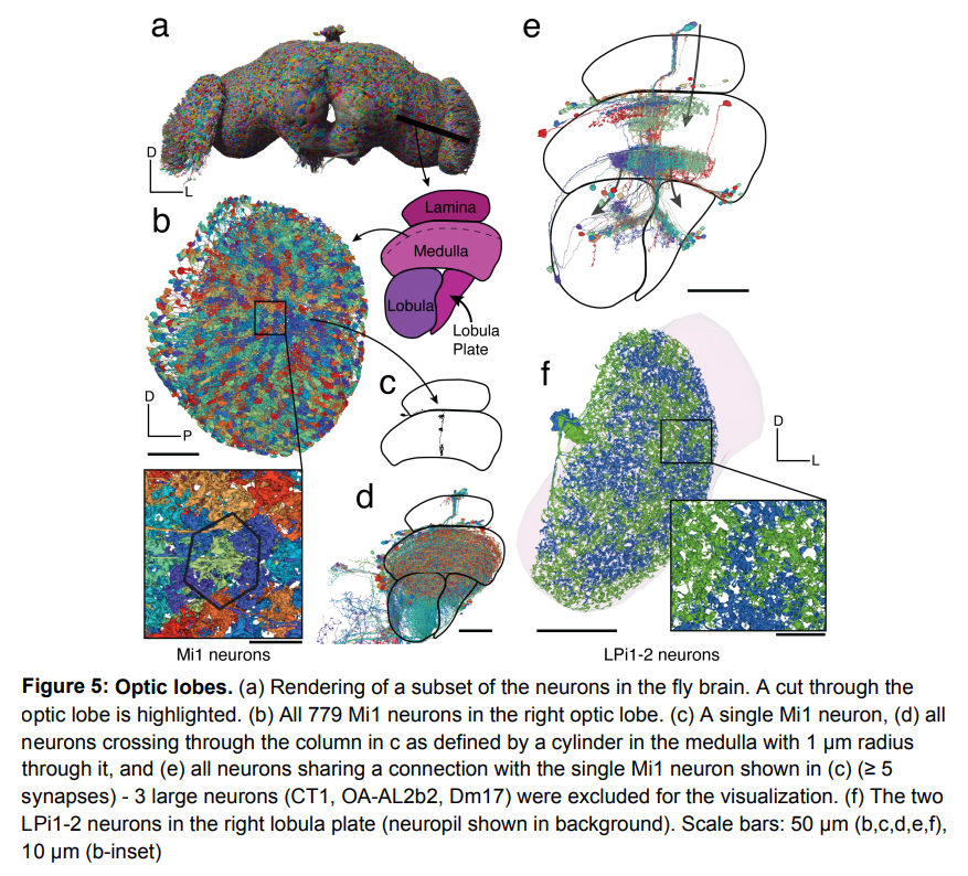 本文表明,该研究对整个果蝇大脑的重建所得到的连接图已经足够完整,足以被称为「连接组(connectome)」。与秀丽隐杆线虫(300 个神经元,小于 10^4 个突触)和果蝇第一龄幼虫(3,000 个神经元,5×10^5 个突触)相比,其连接组有了明显的飞跃:连接组不仅仅是数量上超越了果蝇半个大脑,它还涵盖了果蝇中央大脑的食道下区(SEZ),该区域对味觉和机械感知等非常重要,此外,连接组还涵盖了从果蝇大脑向下驱动运动神经元的过程。