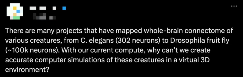 在该成果发布之后,有人表示:「许多项目绘制了各种生物的全脑连接组图,从秀丽线虫(302 个神经元)到果蝇(约 100k 神经元)。以我们目前的计算能力,为什么不能在一个虚拟的 3D 环境中对这些生物进行精确的计算机模拟呢?」