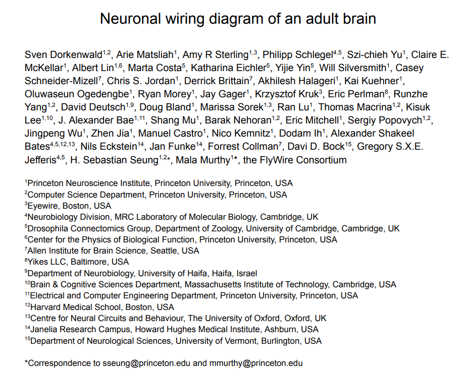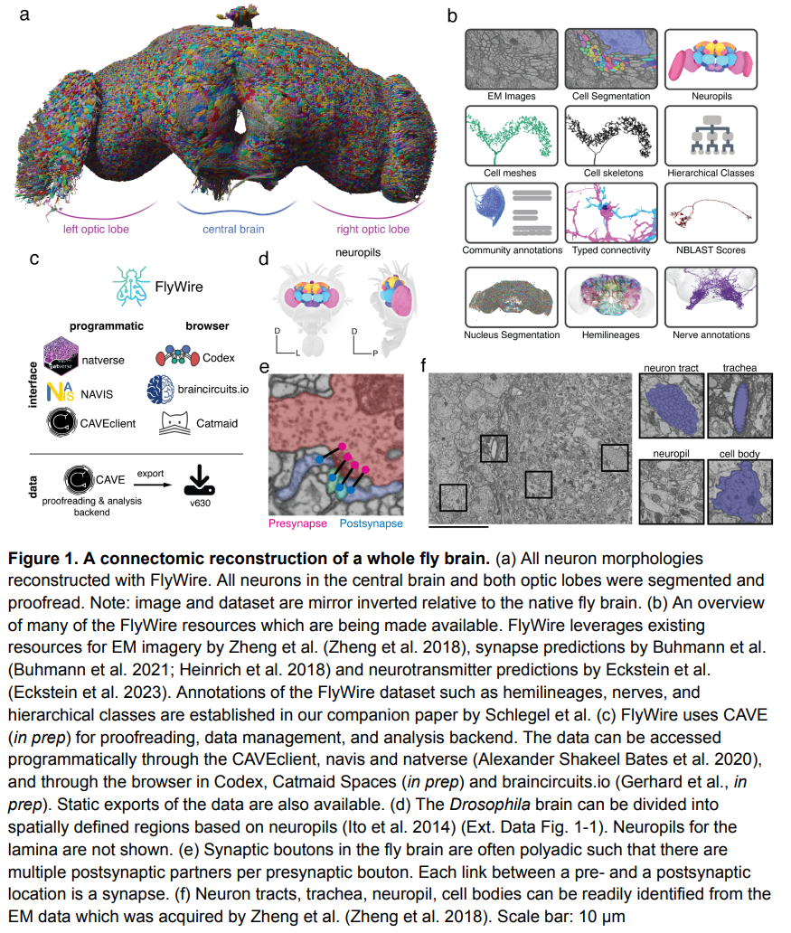 研究者对果蝇的研究还在继续,近日,来自普林斯顿大学等机构的研究者发布了果蝇的全脑连接组,包括约 130k 个注释神经元和数千万个类型突触。