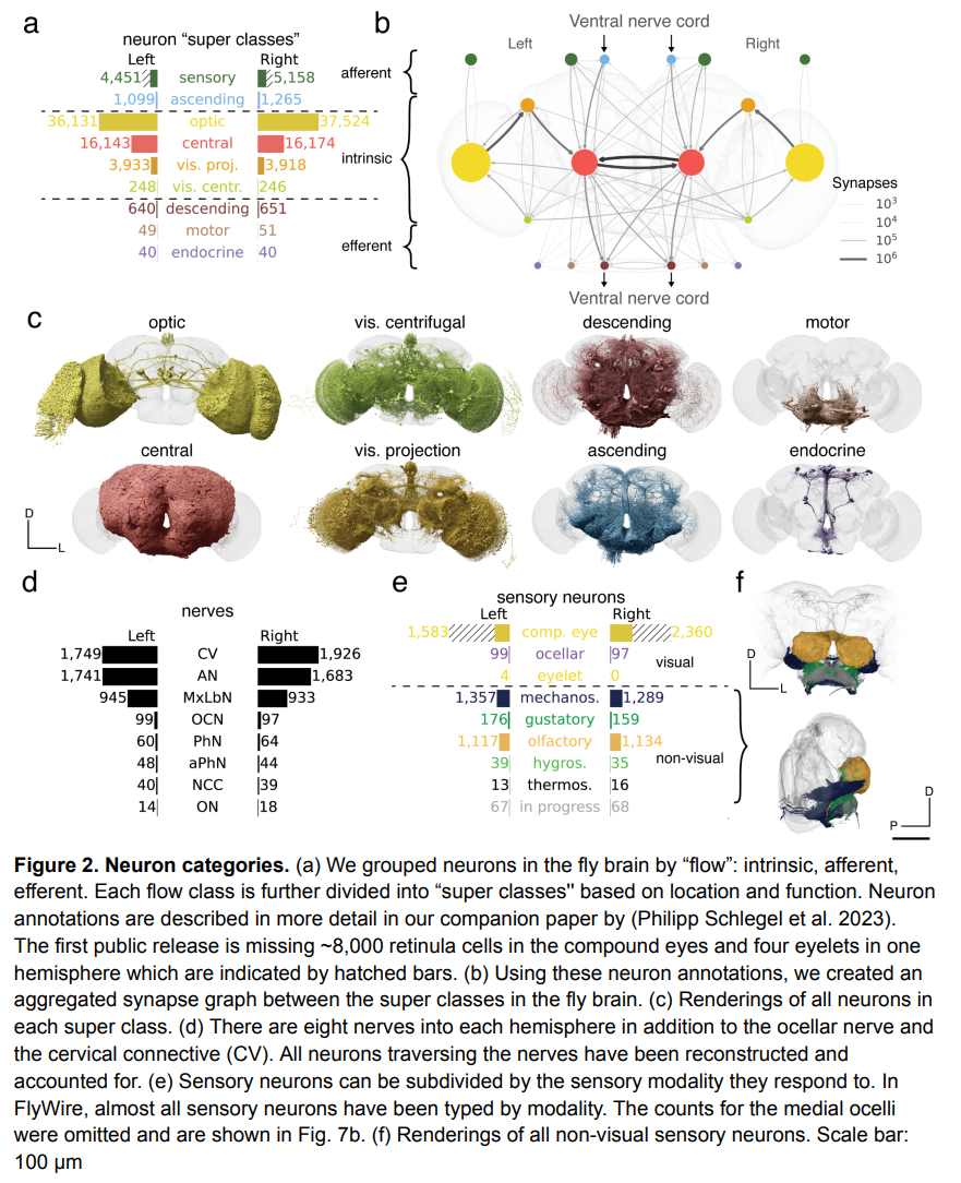 下图为神经元类别,图(a)显示将果蝇大脑中的神经元按「流」进行分类:内在的、传入的、传出的。然后每个流类根据位置和功能进一步划分为「超类」。第一次公开发布的复眼缺失了约 8000 个视网膜细胞和一个半球的四个小眼珠,这些部分用阴影条表示。(b)利用这些神经元注释,该研究在果蝇大脑的超类之间创建了一个聚合的突触图。(c) 每个超类中所有神经元的效果图。(d) 除了眼神经和颈结缔组织 (CV) 外,每个半球还有 8 个神经。所有穿过神经的神经元都被重建和解释了。(e) 感觉神经元可以根据其对感觉模态的响应进行细分。在 FlyWire 中,几乎所有的感觉神经元都已经按模态进行了分类。(f) 所有非视觉感觉神经元的渲染图。