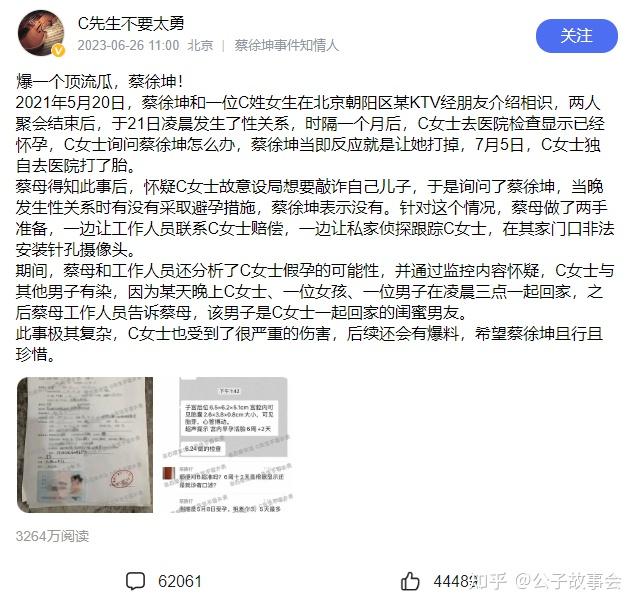 6月26日,狗仔爆料,2021年5月20日,“大明星”蔡某坤和一位C姓女士,在北京朝阳区的一个KTV经朋友介绍相识,两人在聚会结束后发生了男女关系。