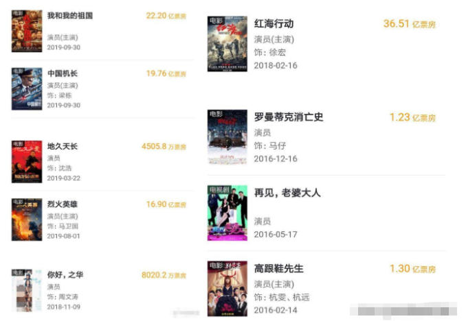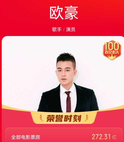 再比如欧豪,热衷于在主旋律大片中刷脸的他,轻轻松松就能攒够100亿的电影票房。