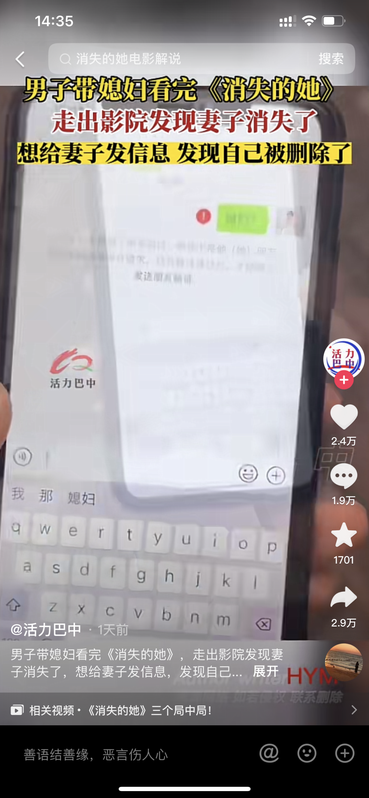 据传,男子带媳妇去看《消失的她》,出了影院发现妻子消失不见。想给妻子发信息,发现自己被删除了。电影的桥段,竟然活生生给出现了。