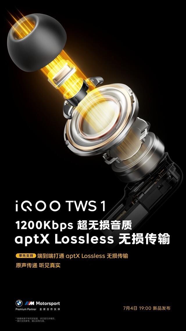 “无损音质,声动人心”iQOO TWS 1率先支持端到端aptX Losslees无损音频传输,具备自研超宽频声音单元,从音频传输到音乐播放,为用户提供优秀的无损音质聆听体验。同时,iQOO是BMW M Motorsport全球合作伙伴,iQOO TWS 1 还特别限量推出传奇版配色,传承了手机传奇版的经典三色条纹设计,让其在一众TWS产品中脱颖而出,展现出用户的不俗品味。iQOO TWS 1将于7月4日(周二)19:00正式发布,让我们一起期待这款超高颜值、超高音质产品的到来吧!