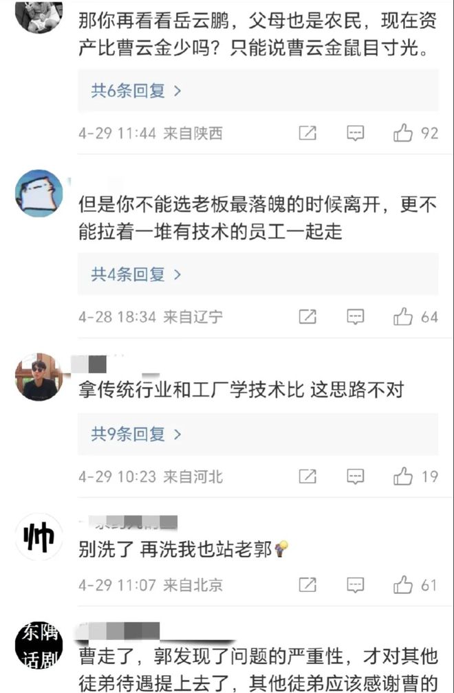 其实,大可不必如此!实践证明小剧场相声是有前途的,老郭有把传统相声进行包装后推向小剧场,对相声界的继往开来作出了贡献,而曹云金的”云直播“的也证明他在与时俱进,在传承传统相声方面还在发挥作用;二人都有本事,应该英雄惜英雄,应该以大局为重!