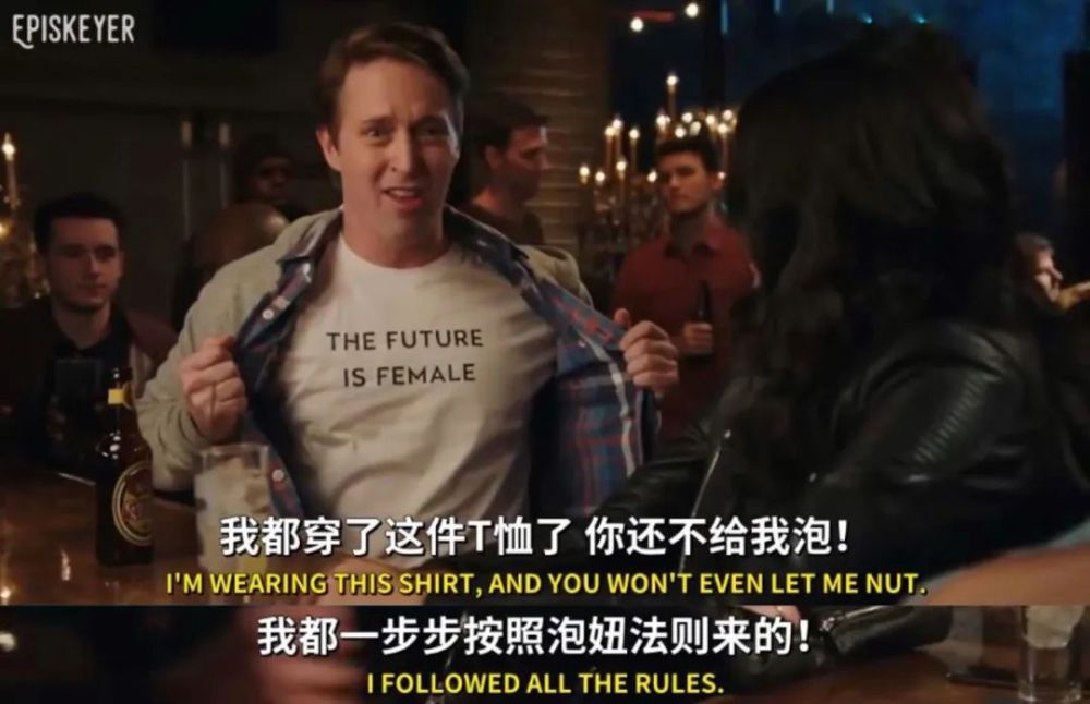 NBC综艺《周六夜现场》做过一个短片《酒吧里的女孩》,画面中不断有男性靠拢搭讪,花式证明自己支持女性后,便迫不及待地发出上床邀约,一旦被拒就果断还击“Bitch”。以上内容呈现虽然夸张,却抓住了女权男“空手套白狼、连夜绣红旗”的精髓。