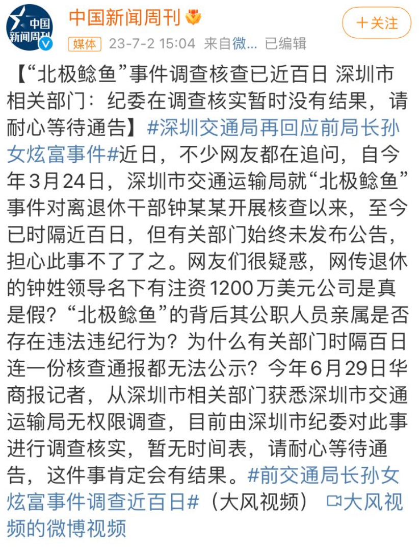 热搜内容就是:有记者从相关部门获悉,目前深圳交通运输局已无权限调查“北极鲶鱼”的事,目前此事已由深圳纪委调查,但调查暂无结果,请耐心等待通告。