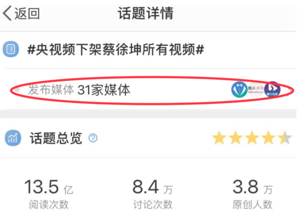目前,“蔡徐坤所有视频被央视下架”这个话题,阅读次数已经达到了13亿,而且还有31家媒体报道了此事:
