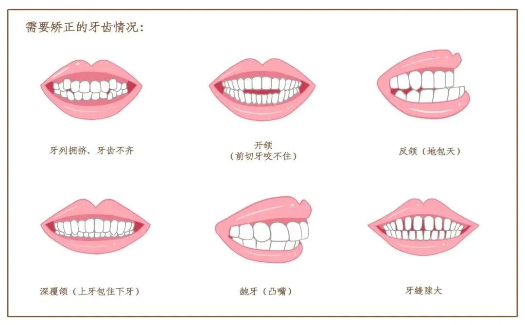 可以对照这个图片,看看自己有没有以上这几种情况,如果发现牙齿已经出现了上述情况,一定要及时到口腔门诊部做矫正治疗。