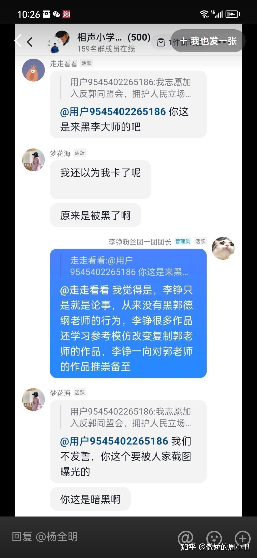 因为举报事件曝光这群人搞一些小号之类的,跑到一个抖音最近很火的专门直播打脸郭德纲的主播群里面卧底,时不时故意发一些莫名其妙的言论,然后被网络德云八公之类的网红刻意剪接进行污蔑。下面俩张图一张是被恶意抹黑的图片,一张是当时的实际情况。
