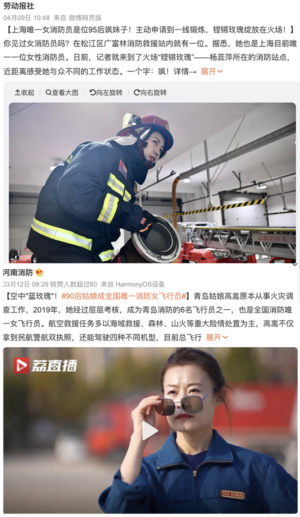除了体育竞技,我看到95后杨蕊萍成为上海基层唯一女消防员,青岛姑娘高嵩成为全国唯一消防女飞行员处理海域、森林、山火等重大险情。