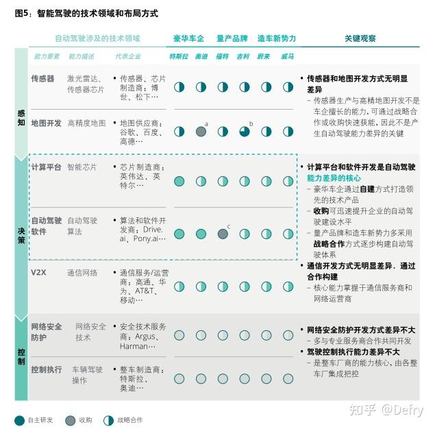 在智能驾驶方面,实现路线有不同,该部分后面章节会介绍,基于不同的路线主机厂需要分别在感知、决策和控制三大方面进行布局: