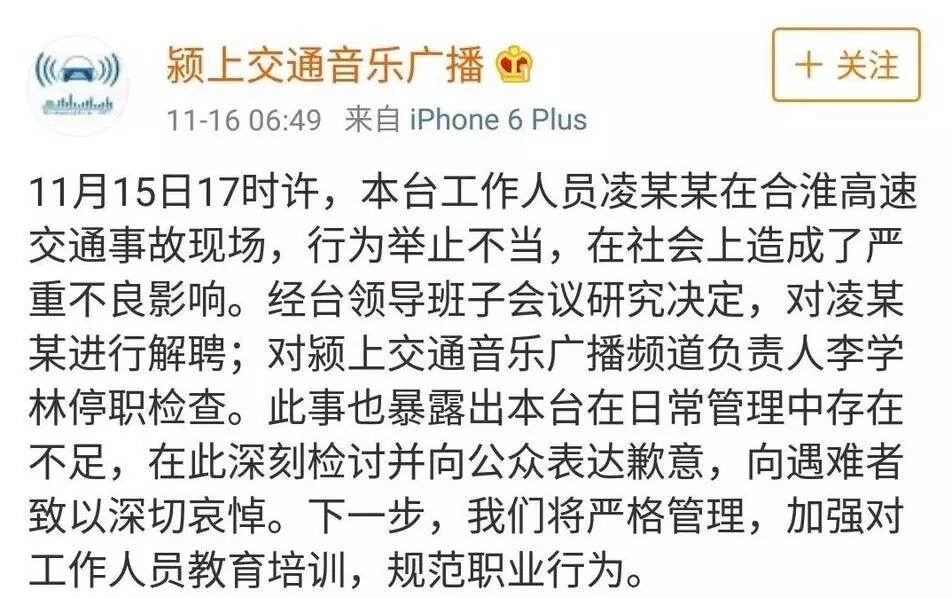 目前,安徽颍上广播电视台已决定解聘凌某某,频道负责人李学林停职检查。颍上交通音乐广播官微致歉称:“此事也暴露出本台在日常管理中存在不足,在此深刻检讨并向公众表达歉意,向遇难者致以深切哀悼。”涉事女主播个人也发布致歉视频。