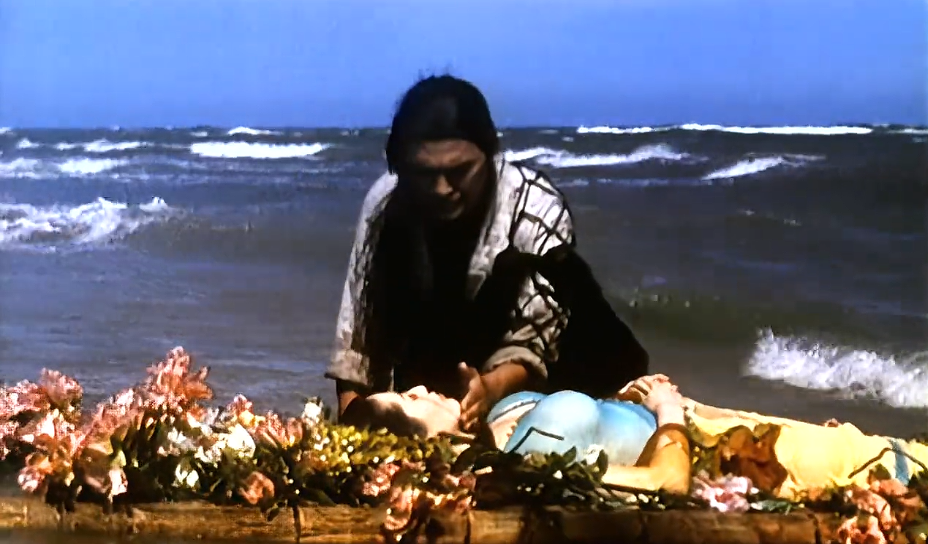 悲痛欲绝的武松将潘金莲的尸体放在一座铺满鲜花的竹筏上,随着海潮飘荡远去……