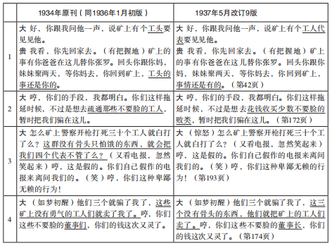 鲁大海作为罢工工人代表来找周朴园谈判,完全没有想到对方竟然是在自己出生三天就抛弃了自己的亲生父亲。第一、二幕中,与鲁贵、周朴园分别谈罢工事宜时,鲁大海有不少台词,体现出作者对于“罢工”的关注点。考察《雷雨》的修订,鲁大海的身份、他如何看待矿上的工人和另外三个罢工代表的问题,最初的作者意图(1934年原刊和1936年1月初版)和后来的修订意图(1937年5月改订9版)之间存在很大差异。涉及鲁大海有关罢工的台词,1937年5月改订9版针对原刊/初版的修订对比情况如下: