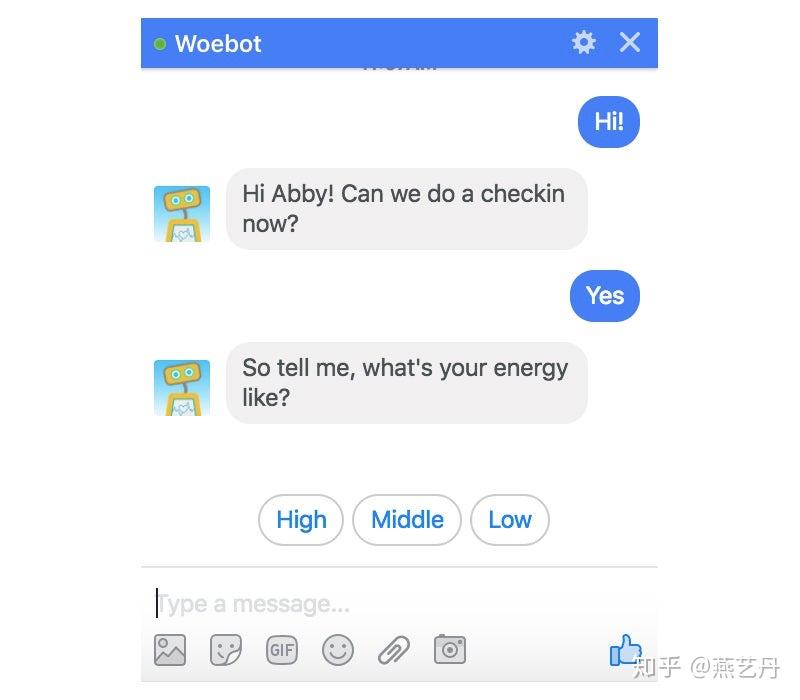 使用woebot的方法十分简单。当你下载这个软件,或在facebook的messenger功能中和他展开对话,ai咨询机器人就会按照预先编好的说辞每天对你进行问候。大多数时候,它会询问你的情绪,你在做什么,鼓励你定期对自己的察觉和分享。