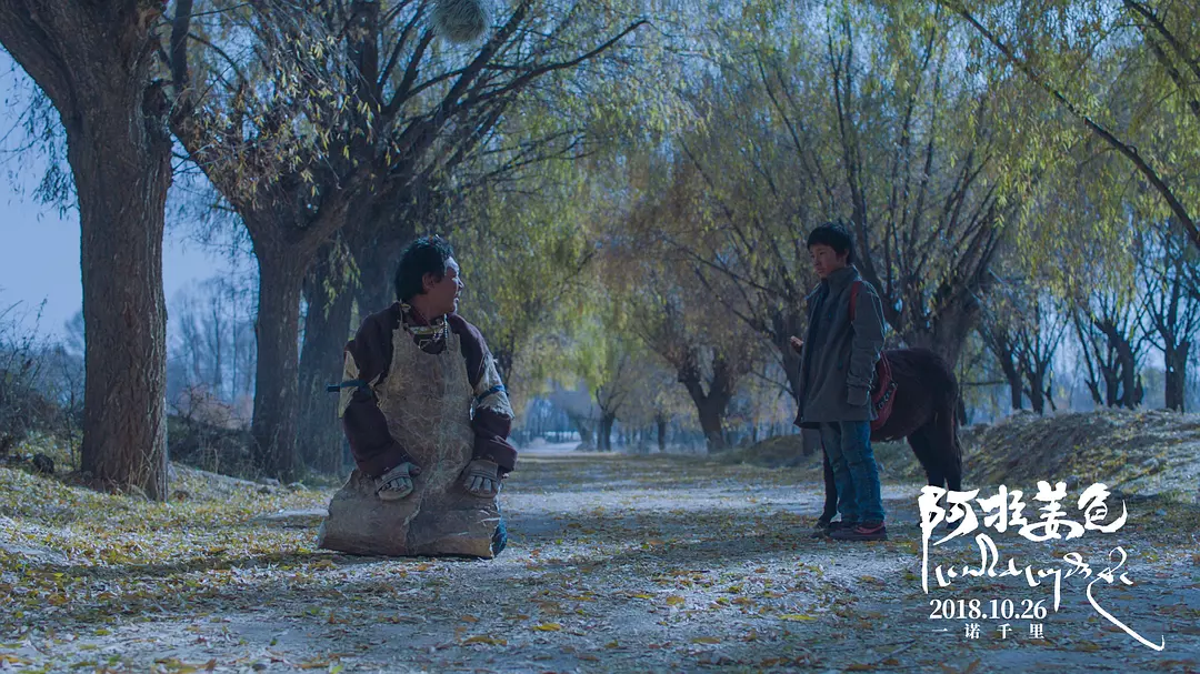 所以,在《阿拉姜色》中,“朝圣”让一家人面对各自最难以启齿的一面。藏传佛教的这一原典仪式在松太加的手中,成为弥合当下藏族人亲情嫌隙的药膏。而罗尔基和诺尔吾这对重组家庭的父子,更是需要借助宗教仪式,形成世俗伦理中的“如父如子”,在松太加的处女作《太阳总在左边》中亦有同样的主题设计。但后者中的“父子”是因宗教而结缘,因顿悟而消散,携带了佛缘因子。