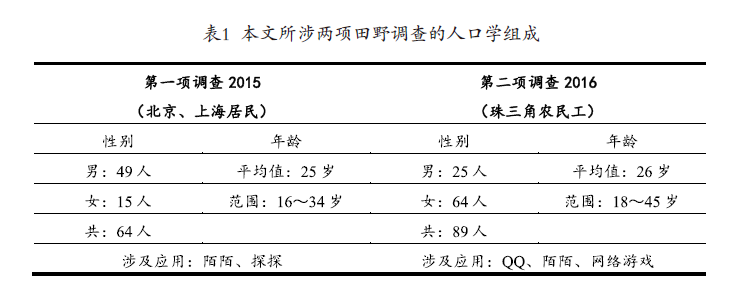 本文对移动社交平台的探讨基于北京和上海都市区域和珠三角工业区的田野调查,这种研究设计正是基于数字鸿沟的假设。目前的中国城市与农村,大都市与小城市的差距依然存在,这种差距会影响对于各类手机应用的使用(Qiu,2009)。由于田野调查所选取的不同场合,研究对象的生活环境、阶层背景和工作性质也不同。因而北京、上海的都市区域,跟珠江三角洲工业区相互补充,正好提供一种跨越地域、阶层和职业的理解。
