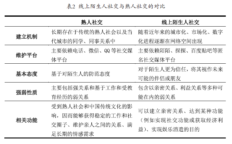 本文的另一发现是,存在于移动社交平台的弱关系可以为人们带来相应的利益:亲密关系、兴趣社交、经济利益、娱乐消遣。这些关系既可以维持在弱关系的程度,也可以转化为强关系。由于传统熟人社交所带来的强关系,以及主要基于工作而存在弱关系,无法给当代城市中的年轻人提供足够的人际和社交支撑,具有多种功能的数字媒体恰好补充了这种缺失。通过提供移动社交平台,打开了以往所无法实现的社交意义。我们基于前面的实证发现,通过表格形式,将陌生人社交与已有社交的对比直观地总结出来,从而更为清晰地展现本文的贡献。