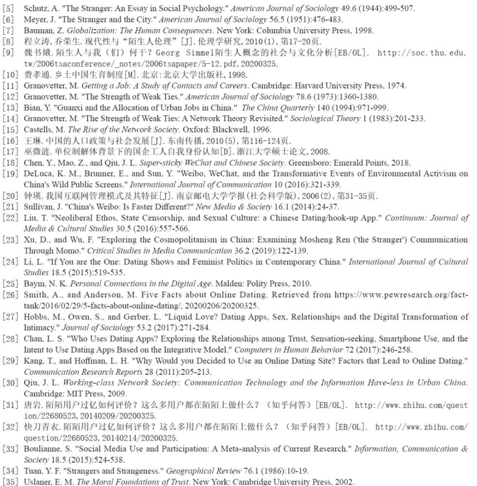 本文存在的局限:第一,研究主要在北京、上海以及珠三角工业区开展,没有选择更多不同层级的城市进行采访和比较,东中西部不同层级的城市,陌生人社交必然存在显著差异。第二,研究者接触到的受访者大多是长期使用移动社交平台的群体,他们对于陌生人的态度能否推广到其他人群尚待考证。第三,本文由两位青年女性学者开展,该研究所收到的回应,必然受到研究者性别身份的影响。第四,本文主要对准基于约会应用的陌生人社交应用,而目前广泛存在于中国城市中的陌生人社交,已经从约会应用扩展到社交媒体、工作应用等其他平台。后续研究可以探讨相关现象在不同地区和城市以及不同社交媒体平台的表现及其内在学理。