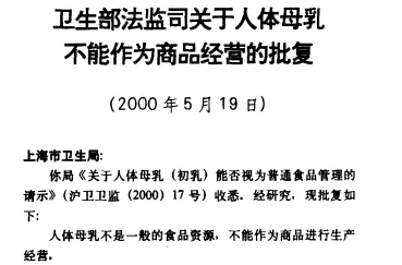其实早在2000年,国家卫生部门就在《关于人体母乳不能作为商品经营的批复》中规定: