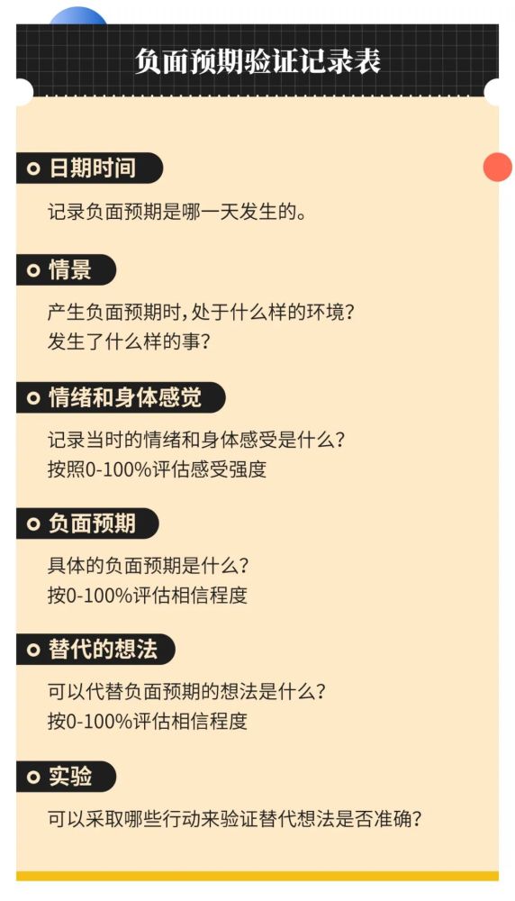 你可以通过负面预期验证记录表,来挑战你平时习惯的负面认知模式,建立更客观的思维模式:
