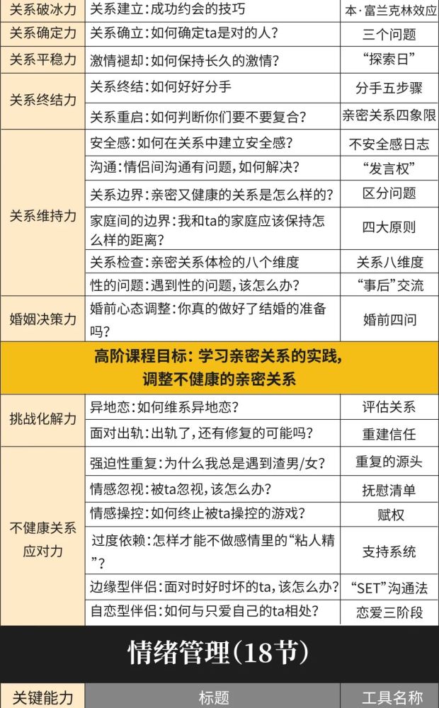 人生必修课针对的是成年初显期及早期(18-35岁)的朋友们,它涵盖了6大人生议题,通过使用80个实用心理学工具,使人们在成年人阶段,应当在各个方面发展出的43种心理能力得到全面提升。