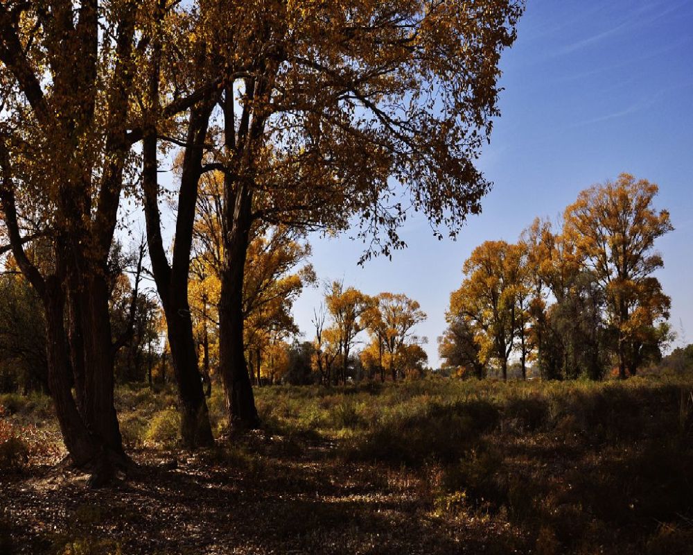 不一样的气候孕育着不一样的植被,胡杨金黄,红柳艳红,倔强的沙枣树彰显生命的顽强,沼泽、草甸在茫茫沙海中焕发出勃勃生机。