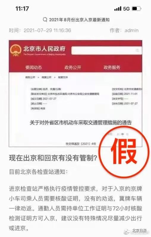 经查,该图片系拼接而成,内容为不实消息,其中《关于对外省区市机动车采取交通管理措施的通告》实际是为进一步缓解本市交通运行压力,减少机动车污染物排放,自2021年11月1日起,在北京行政区域内道路,对外省、区、市号牌机动车采取以下交通管理措施。