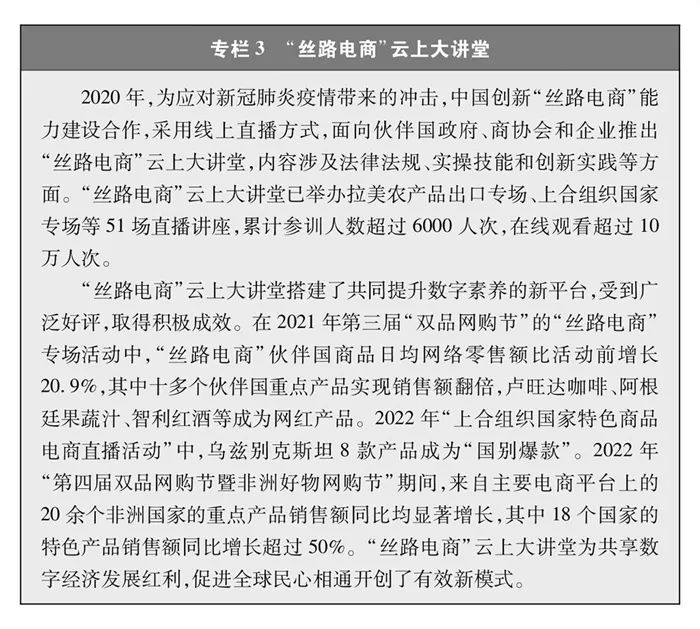 “丝路电商”合作成果丰硕。自2016年以来,中国与五大洲23个国家建立双边电子商务合作机制,建立中国-中东欧国家、中国-中亚五国电子商务合作对话机制,通过政企对话、联合研究、能力建设等推动多层次交流合作,营造良好发展环境,构建数字合作格局。电子商务企业加速“出海”,带动跨境物流、移动支付等各领域实现全球发展。积极参与世界贸易组织、二十国集团、亚太经合组织、金砖国家、上合组织等多边和区域贸易机制下的电子商务议题讨论,与自贸伙伴共同构建高水平数字经济规则。电子商务国际规则构建取得突破,区域全面经济伙伴关系协定电子商务章节成为目前覆盖区域最广、内容全面、水平较高的电子商务国际规则。