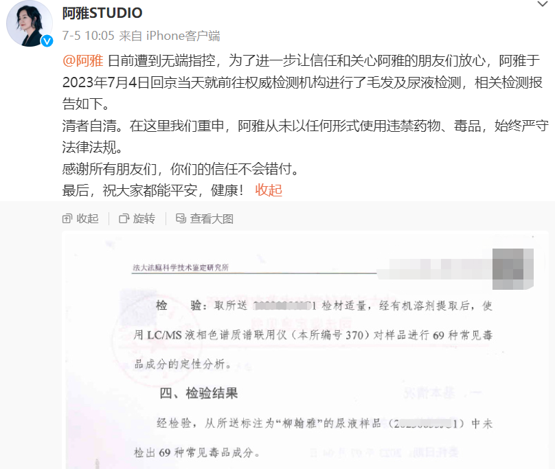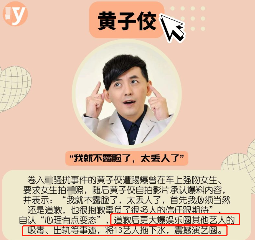 黄子佼在承认性骚扰后,就开始爆料多位艺人的黑料,被爆料的吴宗宪、大小S等人饱受争议后都连忙证清白,阿雅更是去做了毛发检验,晒出报告来自证清白。