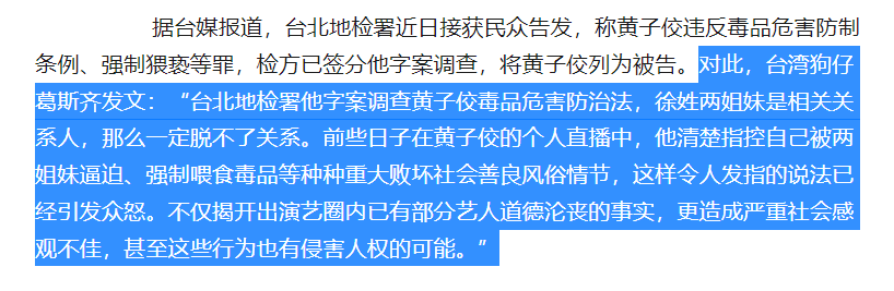 对此,台湾省狗仔葛斯齐发文称,黄子佼涉毒的案子一旦开始调查,徐姓两姐妹是相关关系人,一定也脱不了关系。