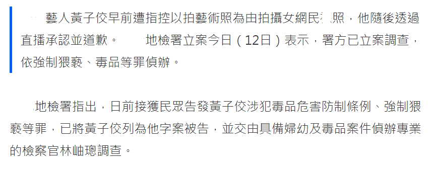 值得一提的是,台媒报道中显示,民众告发的是黄子佼涉嫌违反毒品危害防制条例、强制猥亵等罪,且检方已签分他字案调查。