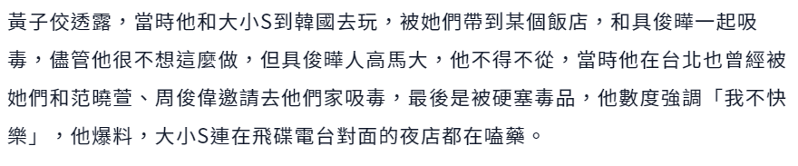 意思就是,黄子佼曾公开爆料称自己被大小S强迫嗑药,所以如果他被查出真的曾涉毒的话,大小S也会受到波及。