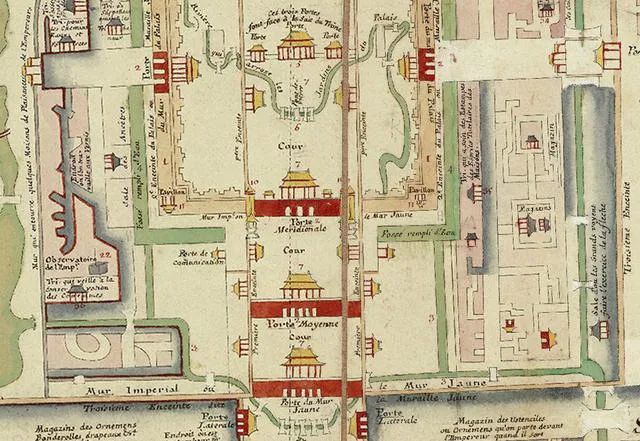 为的是证明紫禁城的午门并不在经线上。由法兰西科学院的天文学者依照法国-葡萄牙教会用天文仪器测定的北京经纬标示,在初图上增加了外城和子午线。