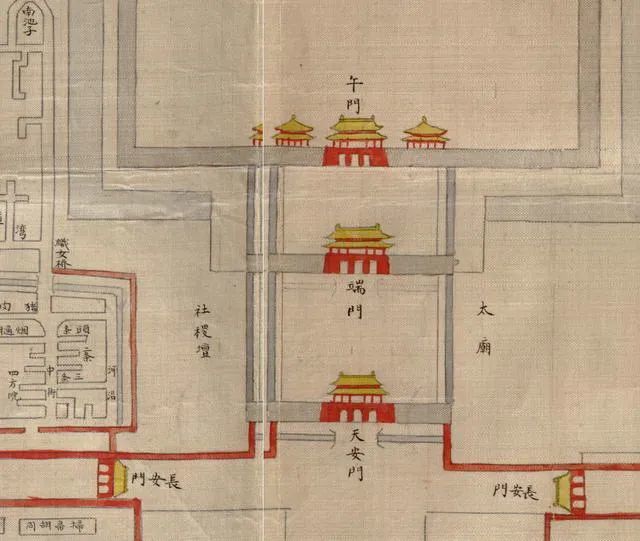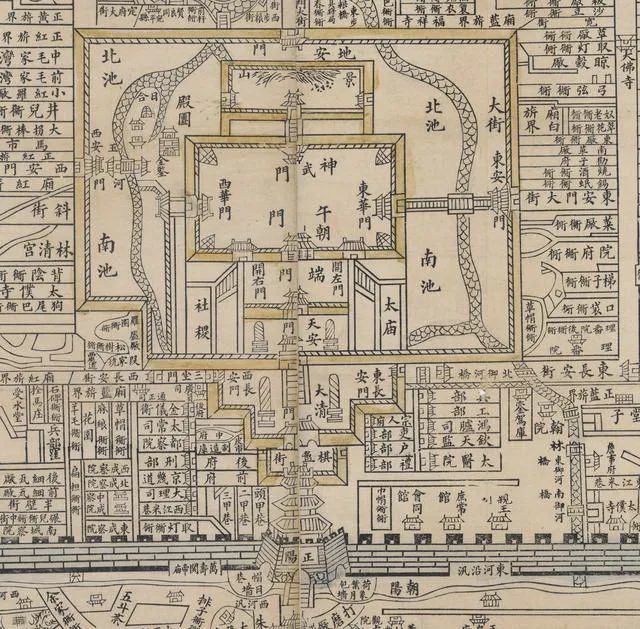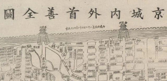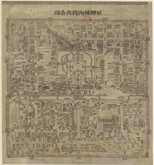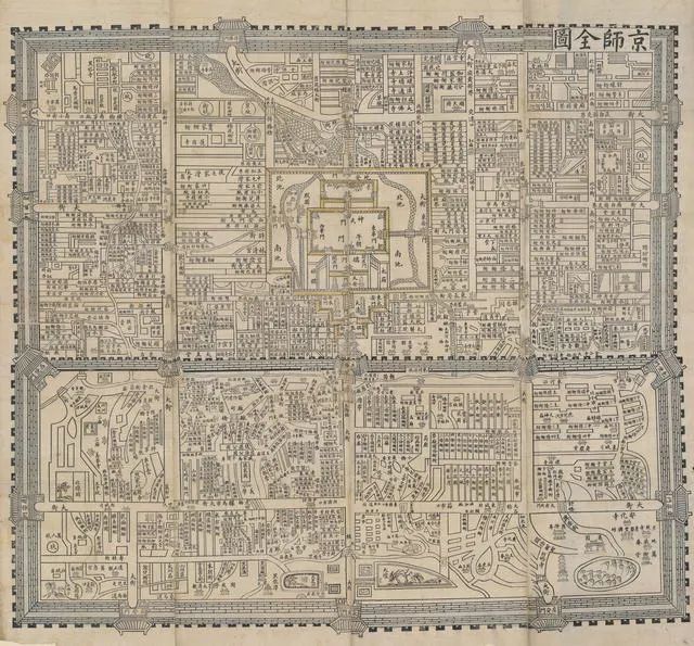 此《京师全图》大致为清乾隆时期淡彩印本(120 x 115 厘米,哈佛大学图书馆藏),未注绘者,详细描绘了北京的街市。