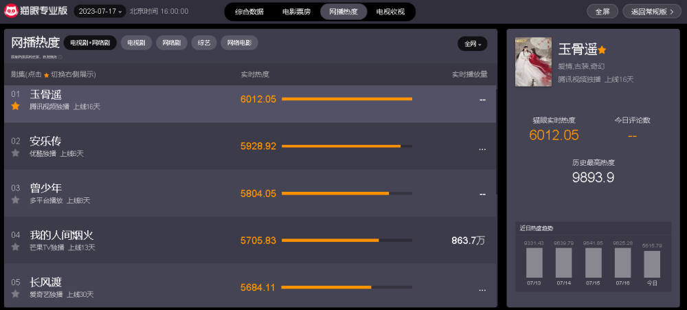 截止7月17日下午16时00分,从“猫眼专业版”实时数据显示可知,当前热播电视剧网播热度榜前五分别如下: