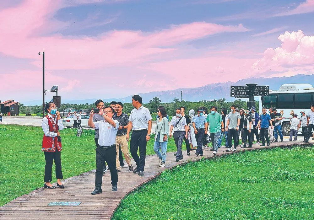 2022年7月19日,游客在昭苏湿地公园观看“天马浴河”。伊犁日报 记者 刘春星 摄
