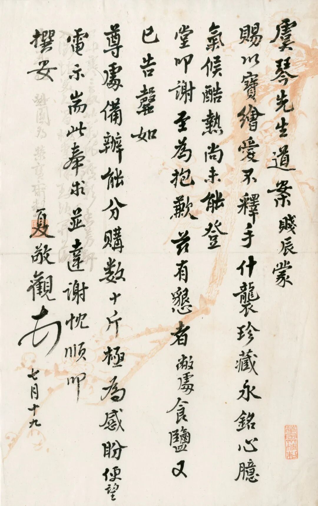 ◎释文:虞琴先生道案:贱辰蒙赐以宝绘,爱不释手,什袭珍藏,永铭心臆。气候酷热,尚未能登堂叩谢,至为抱歉。兹有恳者,敝处食盐又已告罄,如尊处备办,能分购数十斤,极为感盼。便望电示,端此奉求,并达谢忱,顺叩撰安。夏敬观顿首,七月十九。
