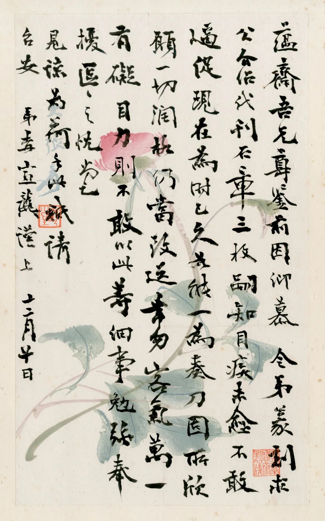 ◎释文:钱橅本耳,恽亦劣画,石涛晚年古拙之笔,与清道人最合。何妨为我购之。当临一幅为谢。苦热珍卫。冲甫吾兄,故清道人顿首。贞翁小字册,奉见还来索矣。
