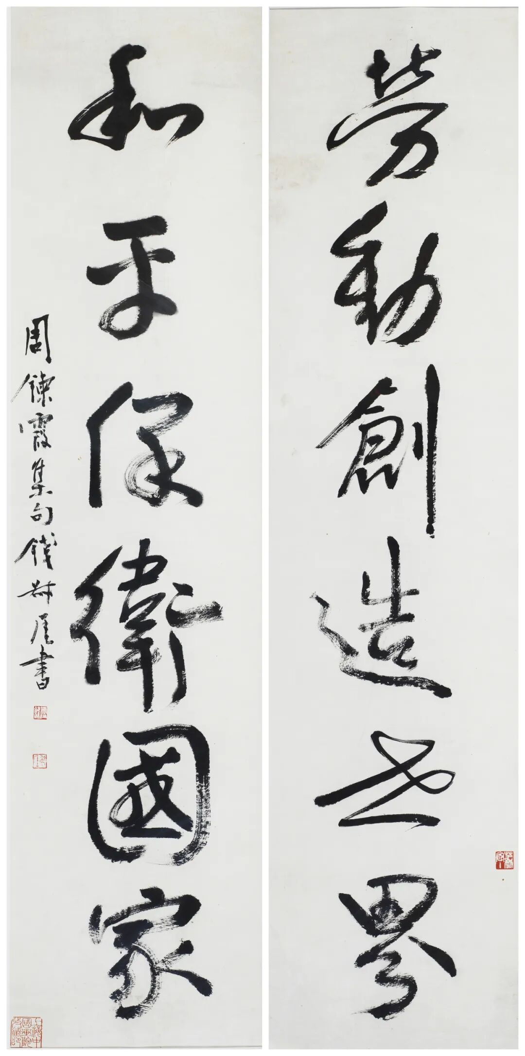 行书 六言联 劳动创造世界 和平保卫国家 111×28cm×2