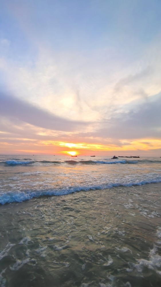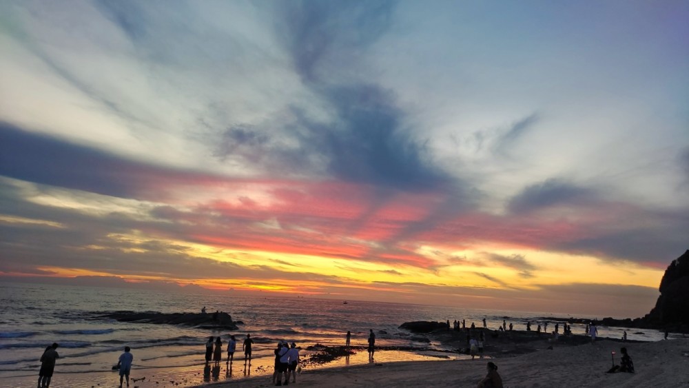 第二天起一大早,骑着小电驴去五彩滩看日出,日出大概在六点左右,我们到那里的时候已经有超级多的人了,看日落还有赶海的络绎不绝。
